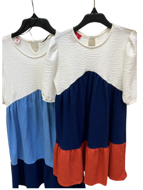 | Estampa | Color block azul, Color block Laranja e azul marinho |