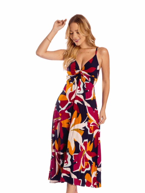 Vestido longo sem mangas com marias na barra e amarração na cintura.
