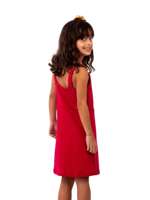Vestido infantil com alça e detalhe com termocolante na barra.